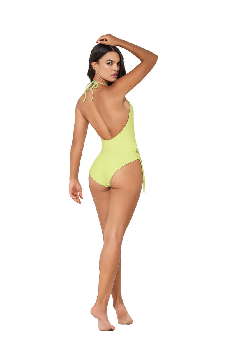 Traje de baño entero con diseño tropical, reversible a un segundo color verde. Contiene copas en el interior. Se amarra al cuello.